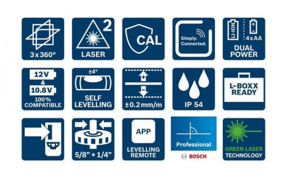 - Υψηλή αποδοτικότητα εργασίας χάρη στις 3 γραμμές 360°: Ταυτόχρονη εκτέλεση οριζοντίων και καθέτων εργασιών χωροστάθμησης σε όλο το χώρο με έναν μόνο εργαλείο.