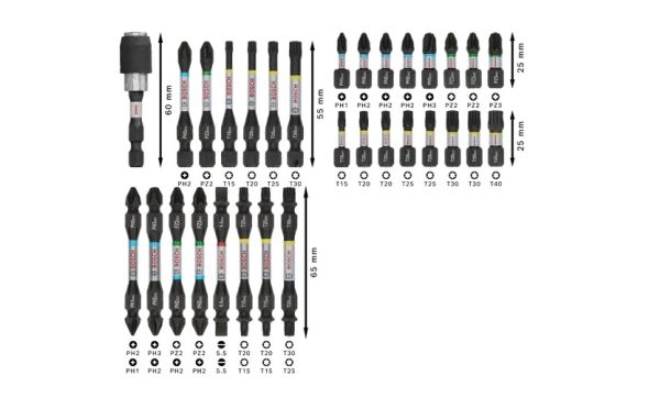 | Κατσαβιδόλαμα 65 mm: PH1/PH2, PH2/PH3, PH2/PZ2 (2x), T15/T20 (2x), T25/T30, SL1 x 5.5/SL1 x 5.5 |