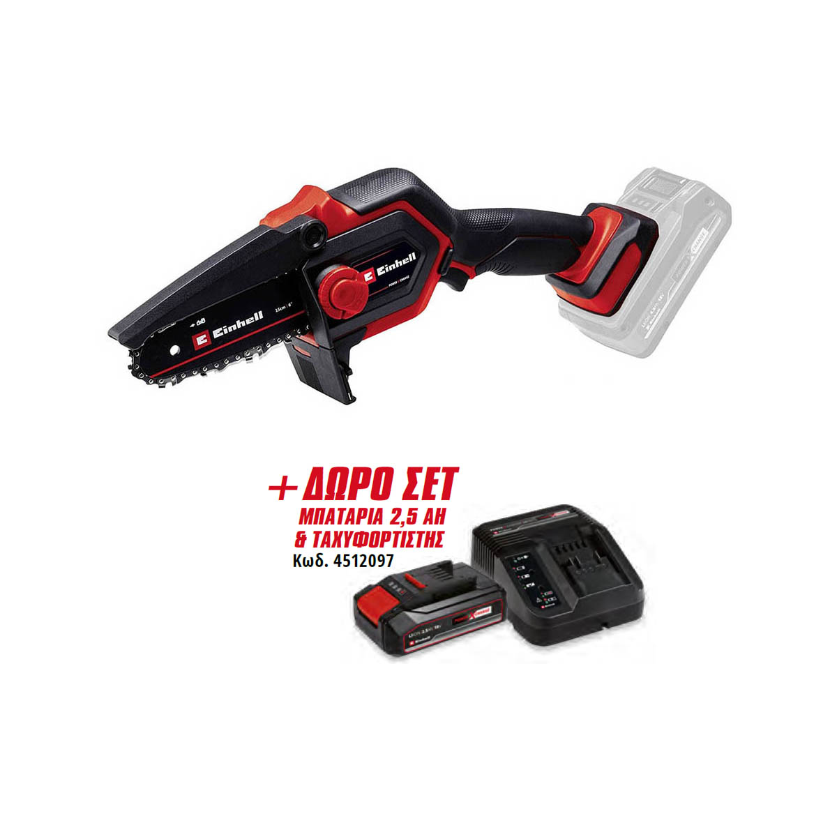 EINHELL - GE-PS 18/15 Li BL-Solo Κλαδευτικό Αλυσοπρίονο Μπαταρίας Brushless 18V Li-Ion & Δώρο Σετ 1 Μπαταρία 2.5Ah και Φορτιστής