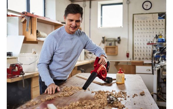 - Αφαιρέστε από την οικοδομή τη σκόνη και τη βρωμιά, αφαιρέστε τα ρινίσματα στο εργαστήριο ή φυσήξτε τρύπες: με ταχύτητα μέχρι 180 χιλιόμετρα/ώρα και στροφές του μοτέρ στο ρελαντί μέχρι 15.500 ανά λεπτό, ο επαναφορτιζόμενος φυσητήρας έχει τεράστια δύναμη και ισχύ.
