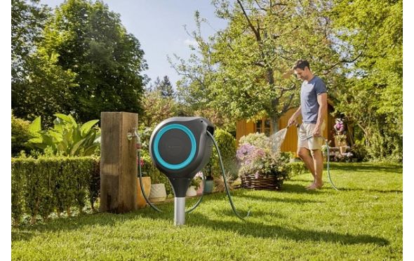 - Το καρούλι είναι ιδιαίτερα συμπαγές και κομψά σχεδιασμένο έτσι ώστε να μπορεί να ενσωματωθεί εύκολα σε οποιονδήποτε κήπο.