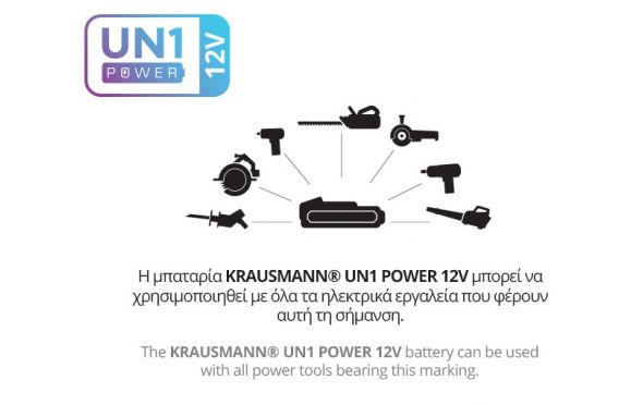 - UN1 POWER - Η μπαταρία KRAUSMANN® UN1 POWER 12V μπορεί να χρησιμοποιηθεί με όλα τα ηλεκτρικά εργαλεία που φέρουν αυτή τη σήμανση.