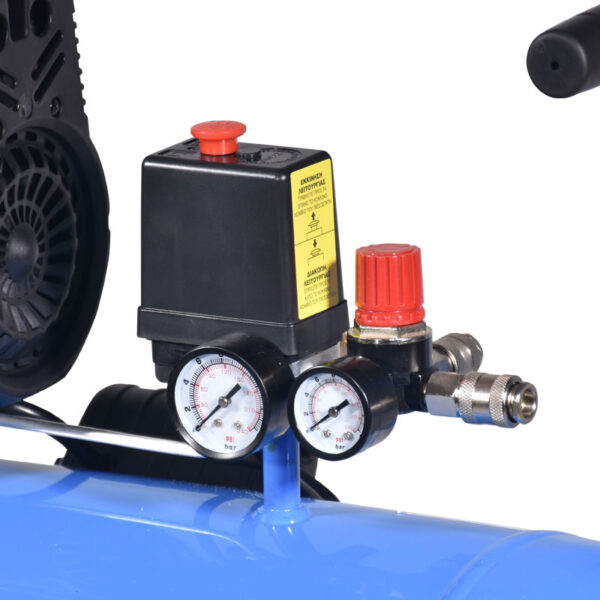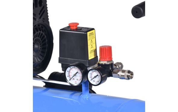Αεροσυμπιεστής με μοτέρ ΕΠΑΓΩΓΙΚΟ με πυκνωτη 30μF και θερμικό με μπουτόν 8Α.Semi - SILENT (Χαμηλής στάθμης θορύβου.Κεφαλή OIL FREE (χωρίς λάδι).Προρυθμισμένος για λειτουργία από 6 έως 8 Bar για καλύτερη απόδοση και μεγαλύτερη αντοχή στον χρόνο.Δυνατότητα ρύθμισης λειτουργίας έως 10 Bar.