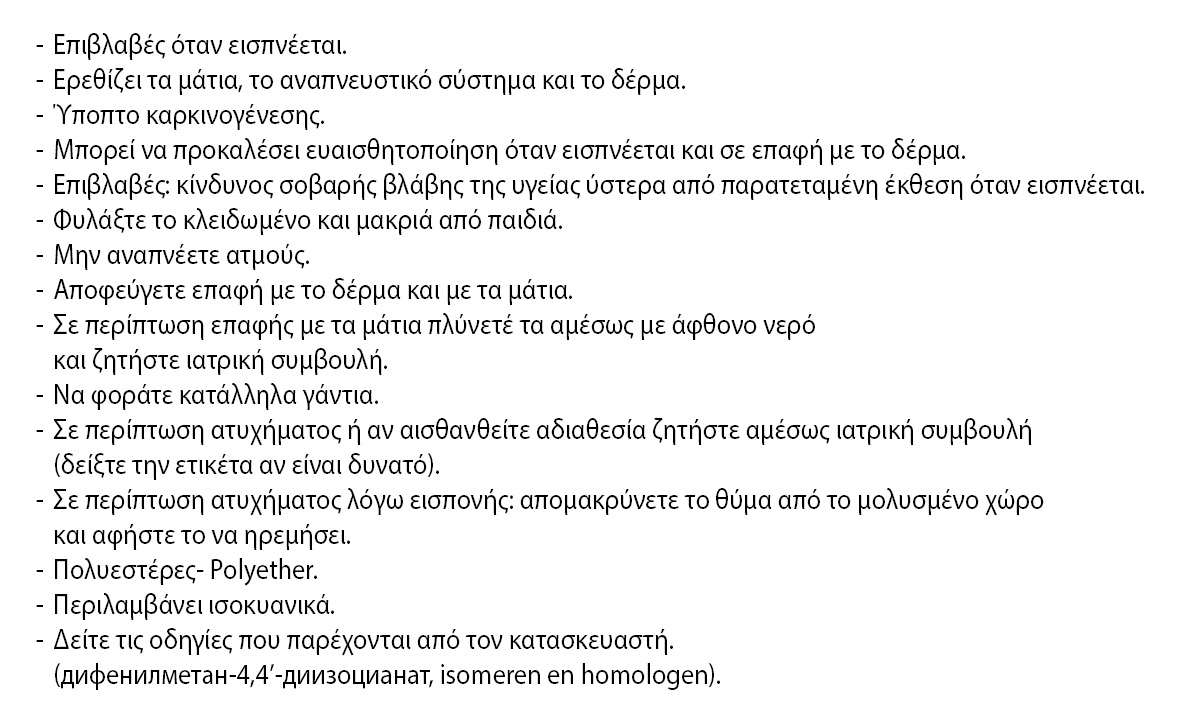 Κατάλληλη για την κόλληση κατασκευών ακόμα και κάτω από ακραίες συνθήκες (κρύο, ζέστη, κάτω από θαλασσινό νερό). Δεν είναι κατάλληλη για κόλληση πολυαιθυλενίου, πολυπροπυλαίνιου, P.T.F.E. και σιλικόνης.