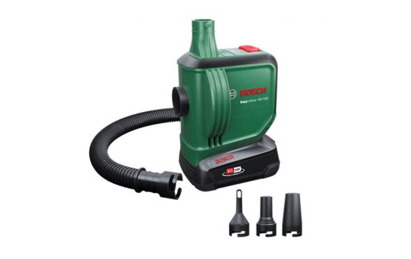 • Η αντλία αέρα μπαταρίας EasyInflate 18V-500 της Bosch με μέγιστη ροή αέρα 530 λίτρα/λεπτό φέρνει ένα νέο επίπεδο ταχύτητας και άνεσης στο φούσκωμα και ξεφούσκωμα παιχνιδιών πισίνας, φουσκωτών σκαφών, στρωμάτων αέρα και άλλων αντικειμένων μεγάλου όγκου.