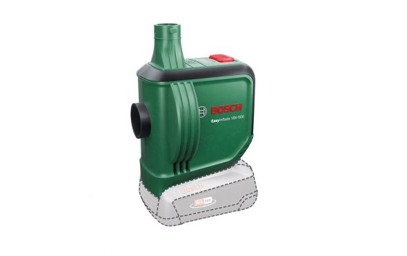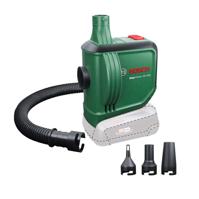 - Η αντλία αέρα μπαταρίας EasyInflate 18V-500 της Bosch με μέγιστη ροή αέρα 530 λίτρα/λεπτό φέρνει ένα νέο επίπεδο ταχύτητας και άνεσης στο φούσκωμα και ξεφούσκωμα παιχνιδιών πισίνας, φουσκωτών σκαφών, στρωμάτων αέρα και άλλων αντικειμένων μεγάλου όγκου.