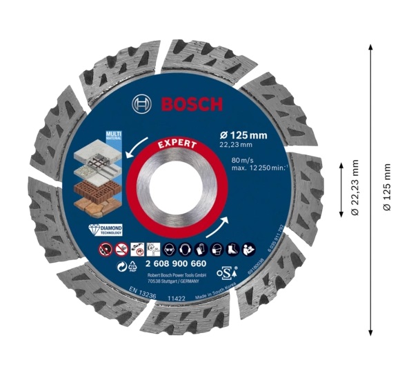 Κοπή οικοδομικών υλικών με μεγάλη διάρκεια Εξαιρετικά ανθεκτική ακμή κοπής, με Bosch Diamond Technology. Τομείς χαμηλής τριβής, σχεδιασμένοι για την ελαχιστοποίηση της φθοράς στις πλευρές. Με εσωτερική διάμετρο 22,23 mm για γωνιακούς λειαντήρες τυπικού παξιμαδιού κλειδώματος Εξαιρετικά ανθεκτική ακμή κοπής, με Bosch Diamond Technology. Τομείς χαμηλής τριβής, σχεδιασμένοι για την ελαχιστοποίηση της φθοράς στις πλευρές. Τομείς συγκολλημένοι με λέιζερ στο χαλύβδινο σώμα για ισχυρότερη σύνδεση.