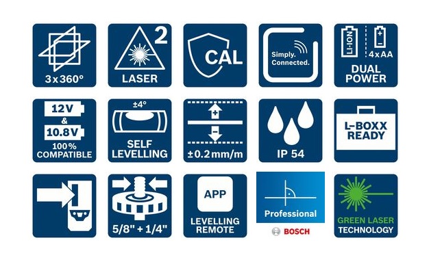 - Υψηλή αποδοτικότητα εργασίας χάρη στις 3 γραμμές 360°: Ταυτόχρονη εκτέλεση οριζοντίων και καθέτων εργασιών χωροστάθμησης σε όλο το χώρο με έναν μόνο εργαλείο.
