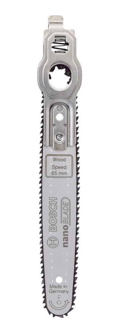 Το nanoBLADE Wood Speed 65 προσφέρει ομαλή κοπή σε ξύλο με ένα βάθος κοπής μέχρι και 65 mm. Μια περιστρεφόμενη αλυσίδα κοπής παρέχει μια εύκολη διαδικασία κοπής με ελάχιστους μόνο κραδασμούς. Ο σταθερός οδηγός εξασφαλίζει ακριβείς γωνίες κοπής και καθιστά εύκολη την ακολουθία των προκαθορισμένων ευθείων γραμμών. Η μύτη κόβει ενεργά και γι’ αυτό υποστηρίζει εφαρμογές βυθιζόμενης κοπής. Αυτό το NanoBlade είναι ιδανικό για χοντρό πριόνισμα για την ολοκλήρωση ενός μεγάλου αριθμού ερασιτεχνικών εργασιών, όπως κοπή ξύλινων κλαδιών ή δοκίδων στέγης, η εγκάρσια κοπή επεξεργαζόμενων κομματιών. Μπορεί να χρησιμοποιηθεί σε ξύλο, λαμινάτ και επίσης σε ορισμένα πλαστικά υλικά, όπως PC, PVC, PMMA και WPC. Αυτό το NanoBlade ταιριάζει σε όλα τα πριόνια NanoBlade...