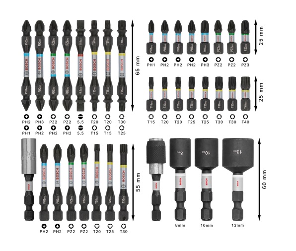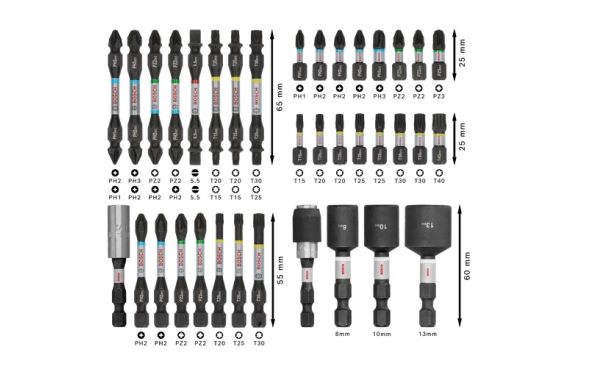 | Κατσαβιδόλαμα 25 mm: PH1, PH2(3x), PH3, PZ2(2x), PZ3, T15, T20(2x), T25(2x), T30(2x), T40 |