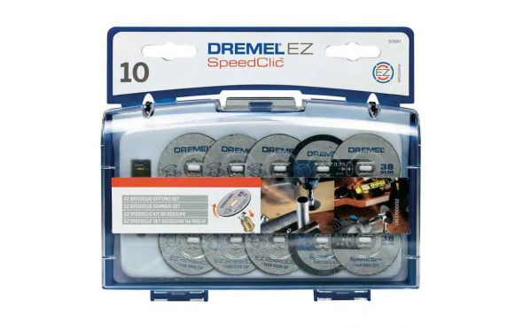 Συλλογή από 10 δίσκους κοπής EZ SpeedClic και το ειδικό στέλεχος EZ SpeedClic. Επιπλέον των 6 κανονικών μεταλλικών δίσκων κοπής 38 mm το σετ συμπεριλαμβάνει 2 ειδικούς λεπτούς δίσκους κοπής και 2 μοναδικούς δίσκους κοπής πλαστικού. EZ SpeedClic είναι το μοναδικό σύστημα γρήγορης αλλαγής για εξαρτήματα περιστροφικών εργαλείων. EZ SpeedClic. Γρήγορα, εύκολα, χωρίς κλειδί.