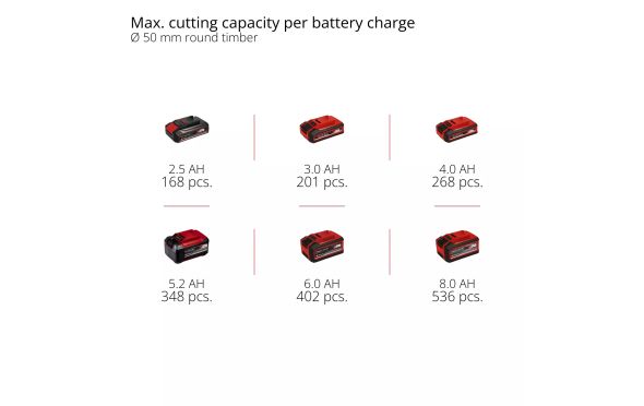 | Μέγιστος αριθμός κοπών σε διάμετρο 50mm:2.5Ah/ 168 κοπές, 4.0Ah/ 268 κοπές, 5.2Ah/ 348 κοπές |
