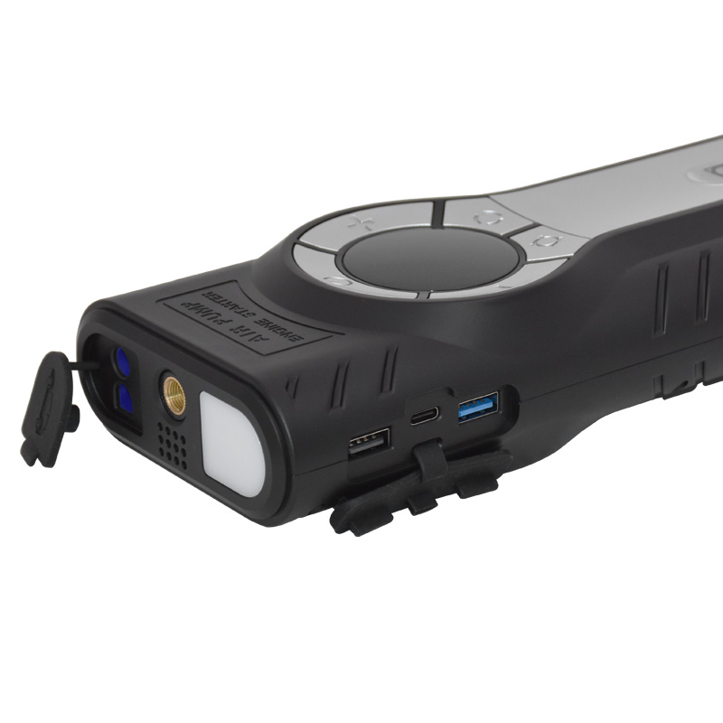 Πολυεργαλείο 4 σε 1. Εκκινητής (jump start) με σύγχρονο design και αναβαθμισμένα ηλεκτρονικά. Ικανότητα εύκολης εκκίνησης οχημάτων με μπαταρία 12V. Χρησιμοποιείται ως εφεδρική μπαταρία (power bank) για φόρτιση κινητών, τάμπλετ κλπ).Χρησιμοποιείται ως τρομπα 150psi για φούσκωμα ελαστικών αυτοκινήτου, ελαστικών ποδηλάτου, για μπάλες, στρώματα αέρος κτλ.Χρησιμοποιείται επίσης ώς φακός LED 3 τύπων: Απλός φακός, Φλάς και Φακός σήματος S.O.S Συνοδεύεται με smart cables (έξυπνα καλώδια) που διασφαλίζουν: • προστασία έναντι ανεστραμμένης πολικότητας • ανεστραμμένης φόρτισης • υψηλής και χαμηλής τάσης • υπερθέρμανσης. Είναι εφοδιασμένο επίσης με φακό LED 3 λειτουργιών (φακός απλός, φλας, S.O.S.).