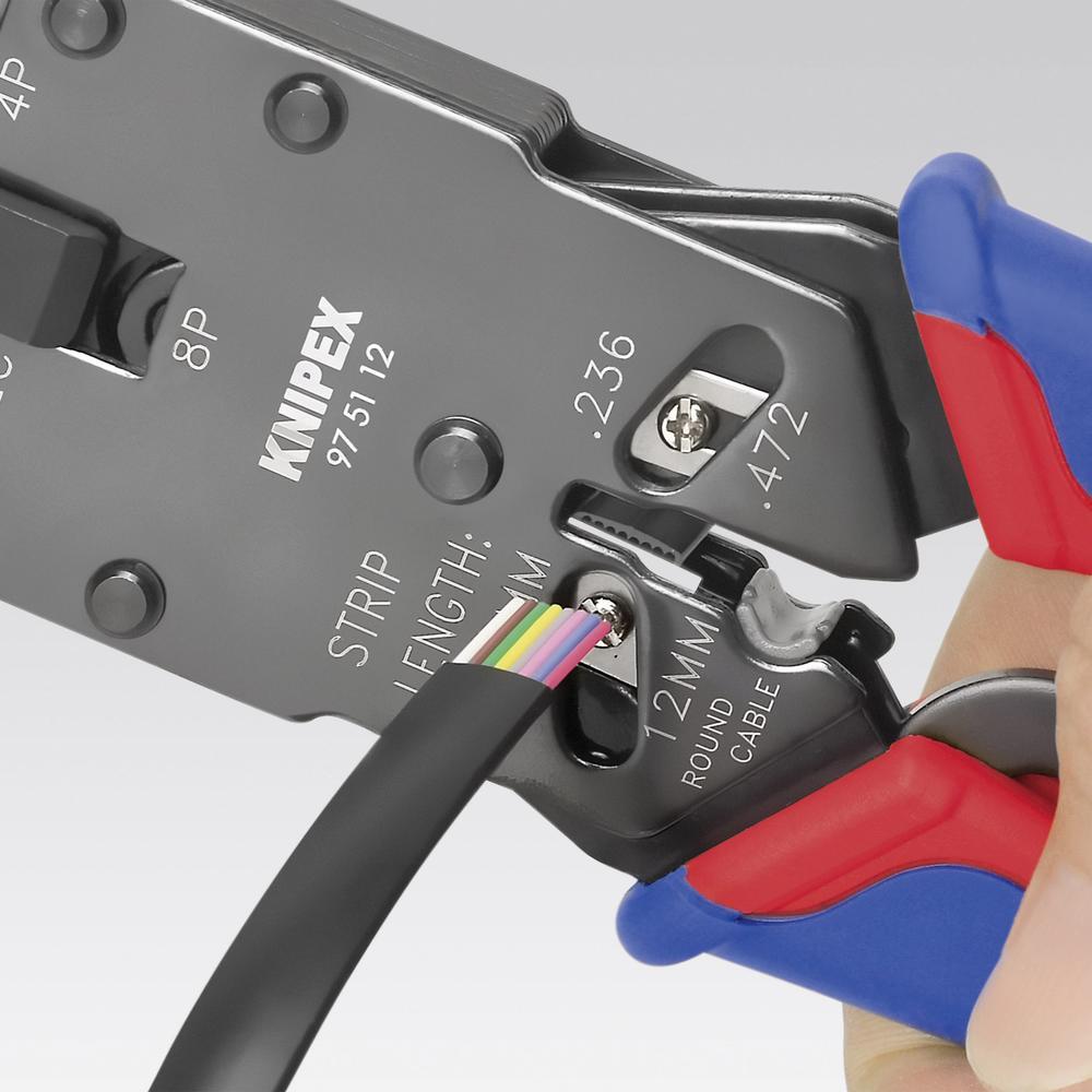 Επαγγελματικό εργαλείο για την κοπή και την απογύμνωση πλακέ τηλεφωνικού καλωδίου για το πρεσάρισμα ακροδεκτών τηλεφωνίας 4-, 6- και 8- οδών τύπου RJ 10 (μήκος 7.65 mm), τύπου RJ 11/12 (μήκους 9.65 mm) και τύπου RJ 45 (11.68 mm μήκος) Παράλληλο πρεσάρισμα υψηλής ποιότητας Επαναλαμβανόμενο, υψηλής ποιότητας πρεσάρισμα χάρη στον ενσωματωμένο μηχανισμό (απασφαλίζει με το τέλος του κύκλου) Βέλτιστη μετάδοση δύναμης χάρη στην λειτουργία υπομοχλίου, εργασία με ελάχιστη μυϊκή κόπωση Με κόφτη και απογυμνωτή για πλακέ τηλεφωνικά καλώδια μήκους 6 και 12 mm Με συμπληρωματικό εξάρτημα για την απογύμνωση στρογγυλών καλωδίων Ηλεκτροχάλυβας χρωμίου-βαναδίου σε εξαιρετική ποιότητα, σκληρυμένος σε λάδι