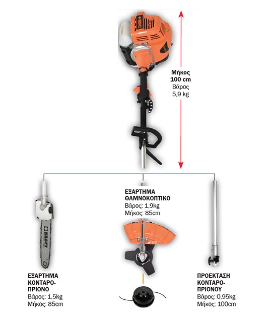 Μπορεί να δεχτεί τρία διαφορετικά εξαρτήματα: θαμνοκοπτικό, κονταροπρίονο και προέκταση.