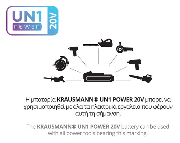 - UN1 POWER - Η μπαταρία KRAUSMANN® UN1 POWER 20V μπορεί να χρησιμοποιηθεί με όλα τα ηλεκτρικά εργαλεία που φέρουν αυτή τη σήμανση.