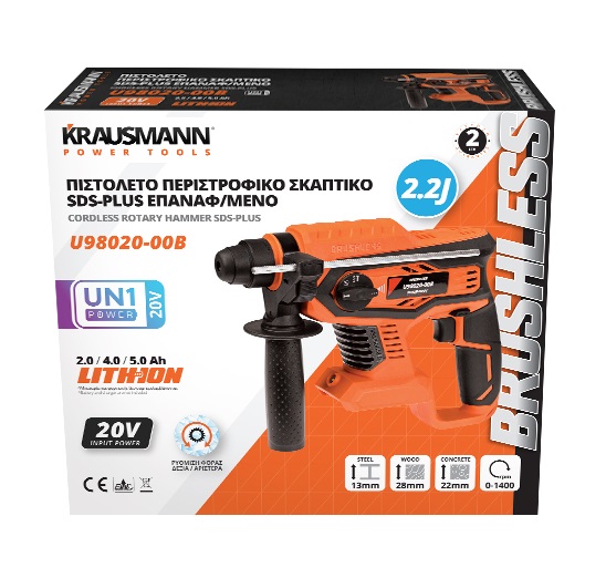 - Πιστολέτο περιστροφικό SDS-Plus επαναφορτιζόμενο KRAUSMANN® U98020-00B, ιδανικό για κρουστική διάτρηση σε τσιμέντο, πέτρα, ξύλο και μέταλλο, καθώς και για ελαφρές σκαπτικές και κατεδαφιστικές εργασίες.