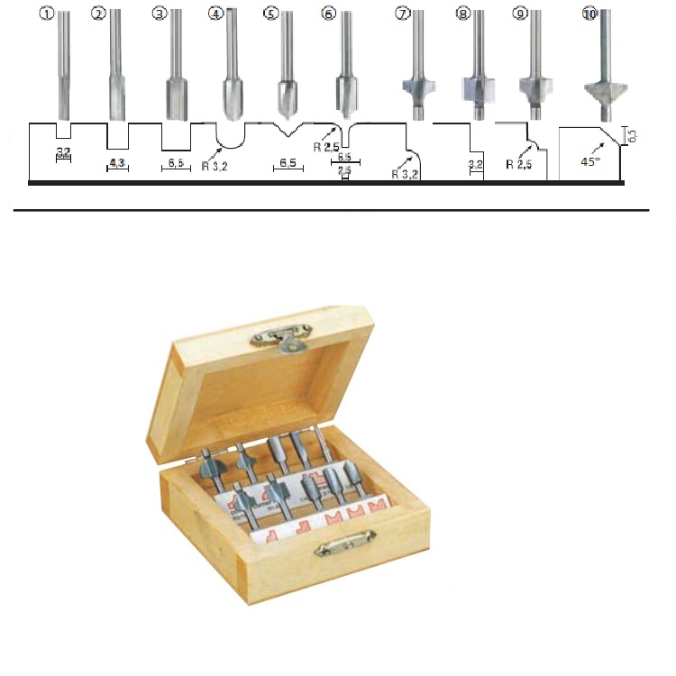 Σετ φρέζες καρβιδίου-βολφραμίου 10 τεμαχίων. Για ξύλο, υαλοβάμβακα και πλαστικά. Καθαρή ανάγλυφη λείανση για άριστα αποτελέσματα εργασίας και ποιότητα. Κατάλληλο για την MP 400 Φρέζα Πάγκου.