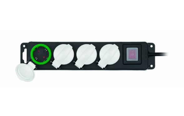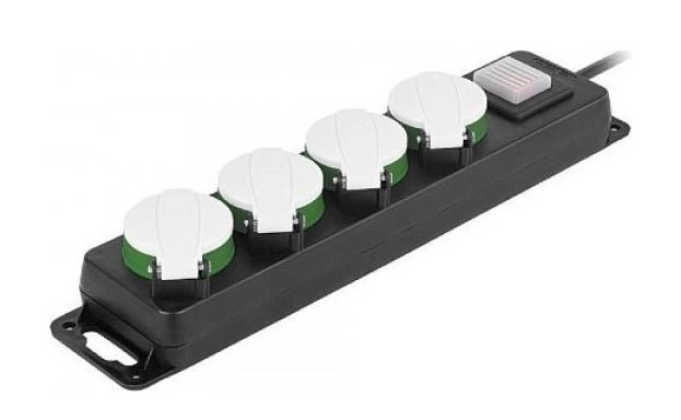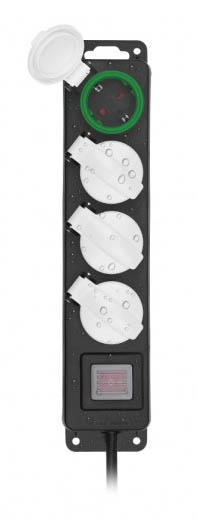 Ειδικό ελαστικό καλώδιο H05RR-F για εξωτερική χρήση. 4 πρίζες σούκο IP44 με ειδικό ελαστικό κάλυμμα για προστασία από το νερό. Διακόπτης με ειδικό κάλυμα για προστασία από το νερό. Εργονομικός σχεδιασμός για εύκολη σύνδεση - αποσύνδεση.