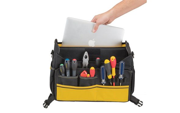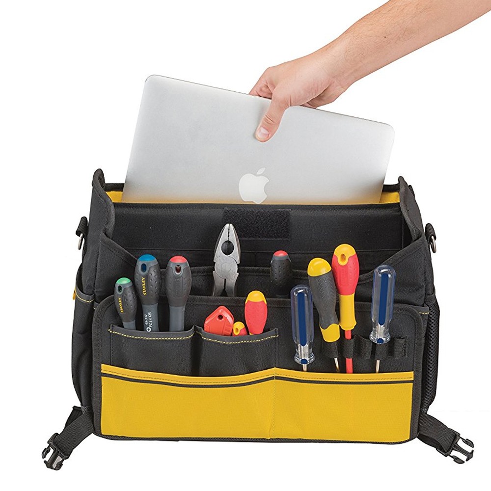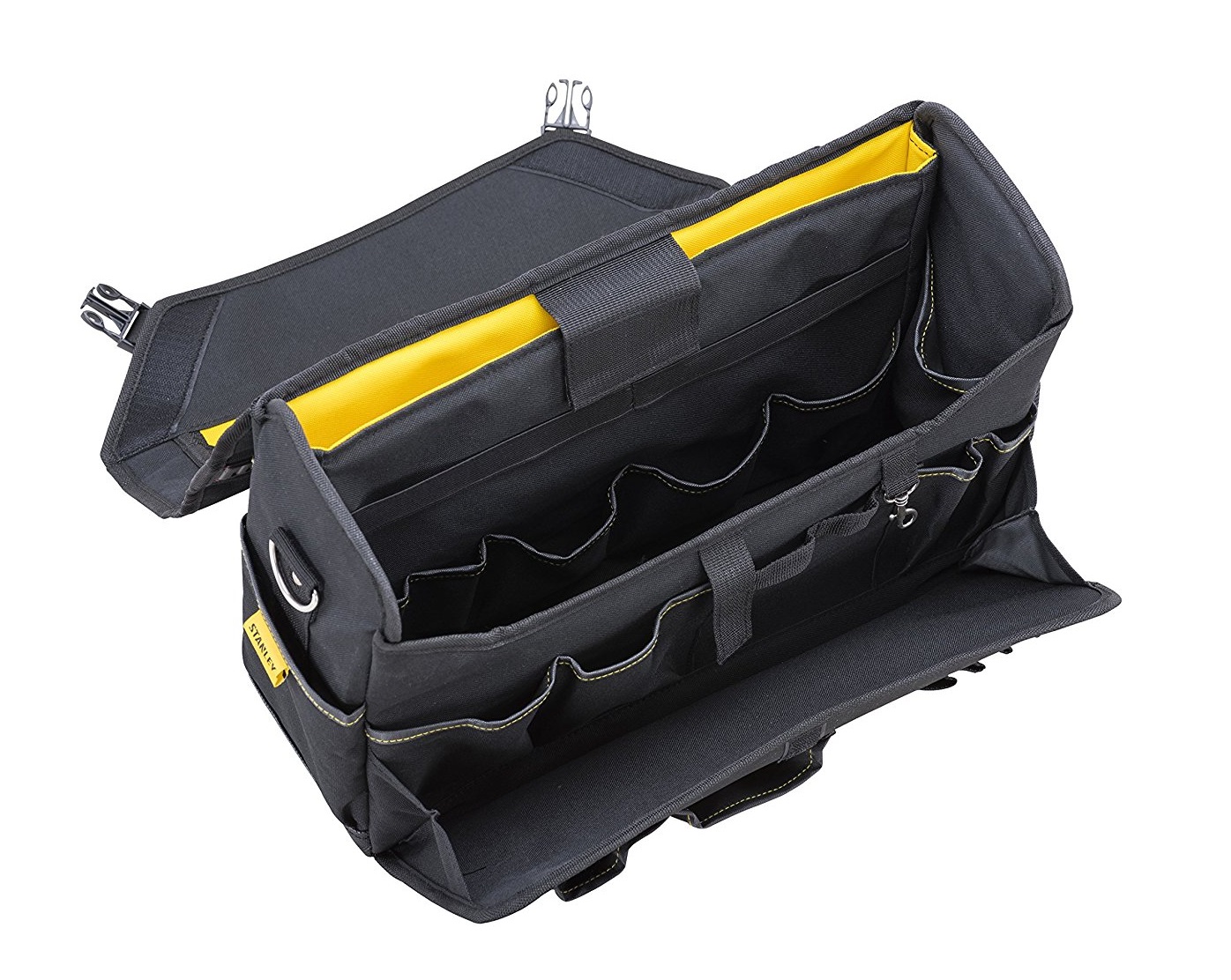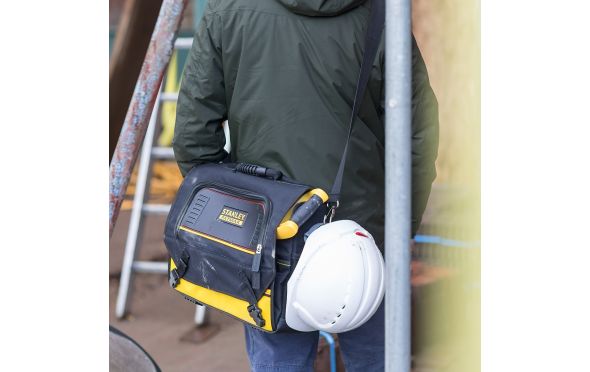 Δυνατό ύφασμα 600 Denier για αντίσταση στην φθορά. Θήκη για φορητούς υπολογιστές, tablet ή A4 χαρτιά. Αδιάβροχος πάτος. Εργονομική λαβή μεταφοράς και ιμάντας ώμου. Η μπροστινή τσέπη της τσάντας επιτρέπει τη γρήγορη πρόσβαση στα εργαλεία σας χωρίς να χρειάζεται να ανοίξετε ολόκληρη την τσάντα. Η τσάντα είναι συμβατή με τους τροχήλατους εργαλειοφορείς της Stanley χάρη στο λάστιχο που διαθέτει στην πλάτη.