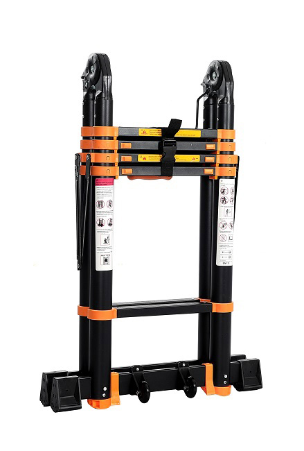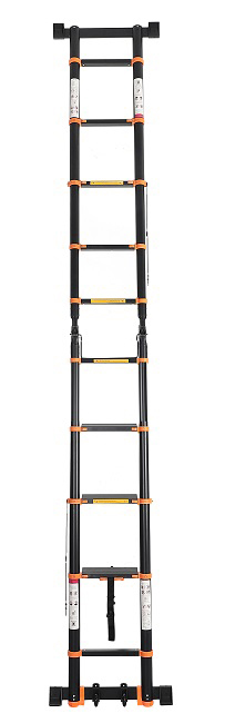 Τηλεσκοπική σκάλα αλουμινίου ηλεκτροστατικής βαφής χρώματος μαύρου. Η τηλεσκοπική σκάλα διπλού συνδυασμού μπορεί να χρησιμοποιηθεί σε ευθεία και λάμδα. Μπορεί να χρησιμοποιηθεί σε πολλές μεταβλητές ύψους εργασίας. Με νέο φαρδύ (8cm) σκαλοπάτι. Ευκολη στην μεταφορά και αποθήκευση λόγο του μεγέθους της. Πολύ εύκολη η λειτουργία των νέων ενισχυμένων κλειδώσεων (42mm). Υπάρχει μεταλλικός σύνδεσμος για μεγαλύτερη ασφάλεια σε χρήση λάμδα. Με τραβέρσες στο κάτω μέρος και στις δυο πλευρές με τέσσερα πέλματα για μεγαλύτερη σταθερότητα και δυο ρόδες για γρήγορη μεταφορά. Η σκάλα κατασκευάζεται σύμφωνα με τα ευρωπαικά πρότυπα EN131. Μέγιστη αντοχή 150kg.