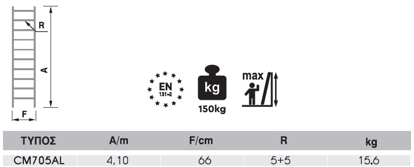 • Η σκάλα κατασκευάζεται σύμφωνα με τα ευρωπαικά πρότυπα EN131.