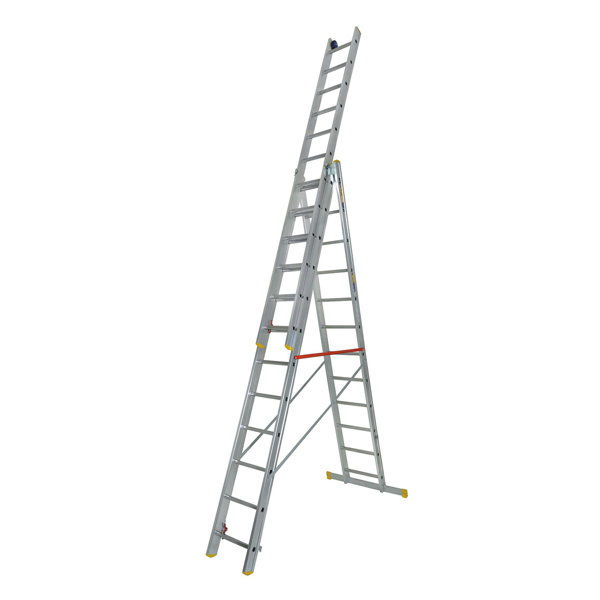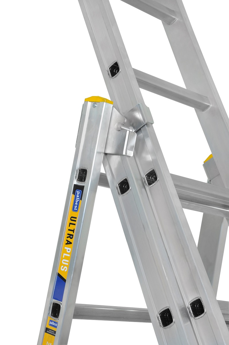 ULTRA PLUS - Σκάλα Τριπλού Συνδιασμού 3 Τεμαχίων (3x14). Ενισχυμένος αυτόματος μηχανισμός ασφαλείας στο κλείδωμα της σκάλας. Με εξάρτημα ασφαλείας που εξασφαλίζει ομαλή  επέκταση της σκάλας. Με ιμάντες μέγιστης αντοχής σε υπεριώδη ακτινοβολία και αντηρίδα για επιπλέον ασφάλεια. Με  τροχούς στο επάνω μέρος για εύκολη επέκταση της σκάλας. Τραβέρσα με πέλματα αντιολησθητικά ECO. Η σκάλα παρέχει όλες τις ευρωπαικές προδιαγραφές EN131. Μέγιστη αντοχή 150Kg.