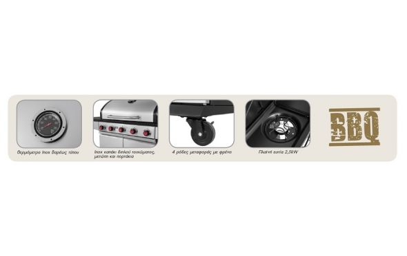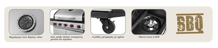 | Με 4 καυστήρες από ανοξείδωτο χάλυβα (inox) 3 kW ο καθένας και 1 πλαϊνή εστία 2.5 kW |