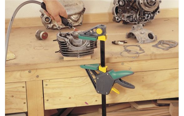 Γρήγορο, ασφαλές και εύκολο σφίξιμο ακόμα και με το ενα χέρι Γερή και ισχυρή δύναμη σύσφιξης μέχρι και 120kg O πιο εύκολος χειρισμός και ασφαλές στερέωμα χάρη στην εργονομική λαβή με ζώνη αντιολισθητική Εύκολη μετατροπή σε λειτουργία απλώματος με το πάτημα ενός κουμπιού Υψηλής ποιότητας ράγα που εξασφαλίζει υψηλή και μεγάλης διάρκειας δύναμη σύσφιξης Εύκολη απελευθέρωση Κάθετο χαράκωμα για ασφαλή σφίξιμο στρογγυλών αντικειμένων Το βάθος σύσφιξης του σφικτήρα, είναι 100mm και το πλάτος σύσφιξης είναι 300mm.