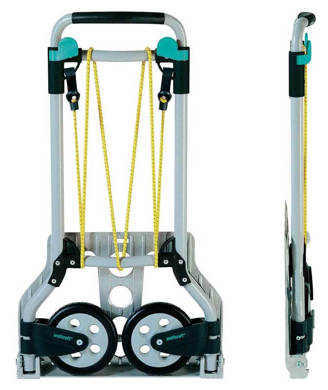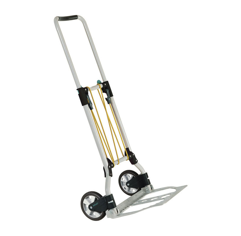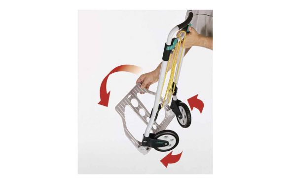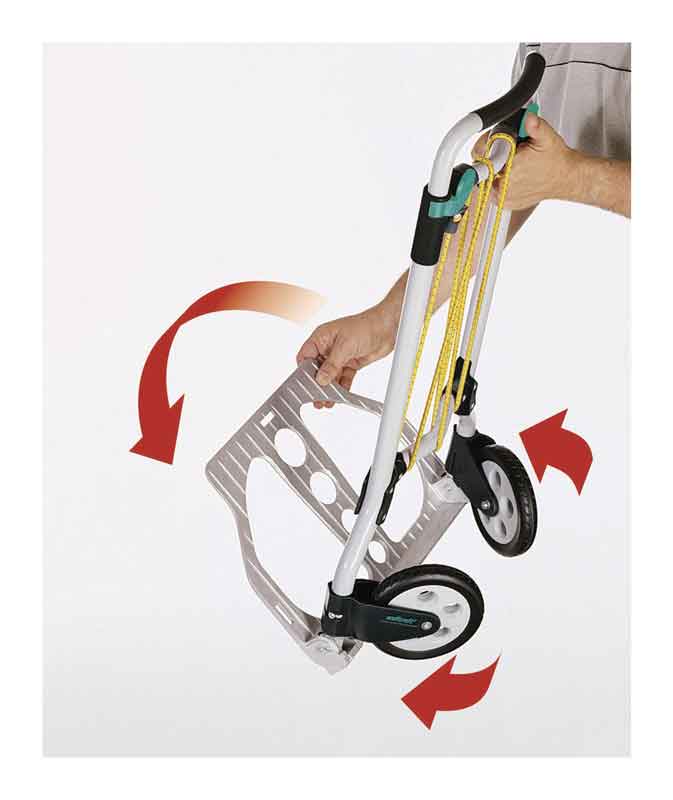 Οι ρόδες και η πλάκα μεταφοράς ανοίγουν με το τράβηγμα μίας μόνο λαβής χάρη στον μηχανισμό αναδίπλωσης Πολύ εύκολο στον χειρισμό, με βάρος μόνο 3,9 Kg Αντέχει βάρη έως 70Kg Μέγιστο ύψος 104cm
